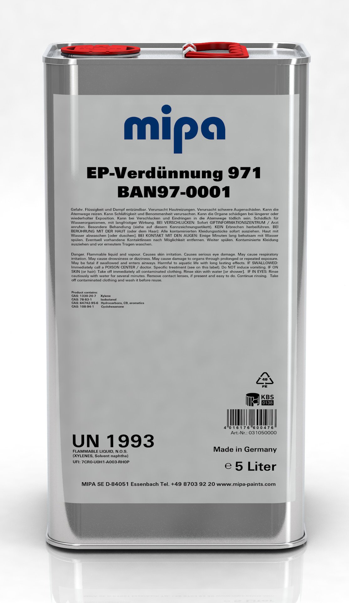 Mipa EP Thinner 971 5 l BAN97-0001 is a thinner in 5 l format, made for adjusting viscosity, blending or spot-repair work in a compatible system. Mipa EP Thinner 971 5 l BAN97-0001 is used where the compatible system needs the right viscosity or a cleaner blend area for spot repair work.