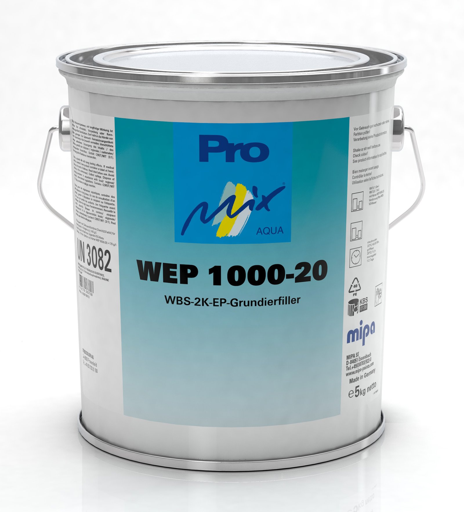 Prepare the substrate thoroughly and remove grease, dust and loose contamination before coating. Mix the product in the stated ratio (5:1) with Mipa WEP 9500-25 WBS 2K EP Hardener; adjust with Mipa WBS VE-Wasser if required. Apply even coats and respect the flash-off, drying and recoating times of the full system.