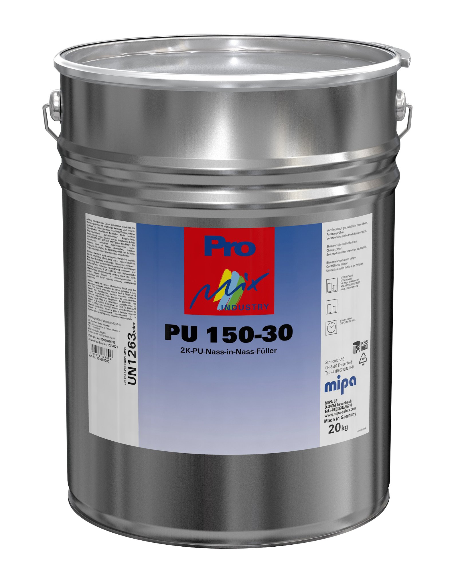 Prepare the substrate thoroughly and remove grease, dust and loose contamination before coating. Mix the product in the stated ratio (5:1 by weight; 4:1 by volume) with Mipa PU 912-xx; adjust with Mipa 2K-Thinner if required. Apply even coats and respect the flash-off, drying and recoating times of the full system. From + 10 °C and up to 80 % relative humidity. Ensure adequate air ventilation